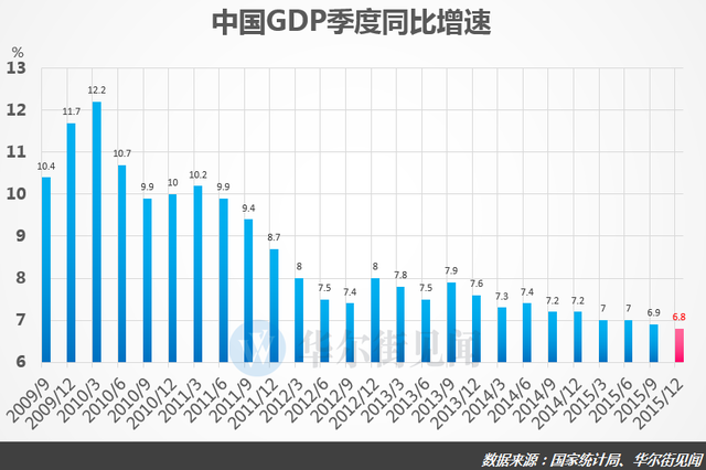 統計局數據初步核算顯示,中國2015全年國內生產總值(GDP)676,708億元,按可比價格計算,增速為6.9%,這是1990年以來的最低增速,彭博新聞社統計的經濟學家對去年經濟增速的預期和前值均為6.9%。