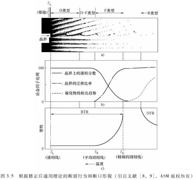 圖30.26a所示的一組照片中,顯示的是在凝固末端,焊縫金屬具有相對較低(<5%)的共晶液相,對應的斷口表面表現出很明顯的樹枝晶特征。圖3.26b所示的一組照片中,顯示的是在凝固末端,焊縫金屬形成了大約10%的共晶液相,這么高的液相比例分數,由于回填作用,導致斷口表面被這些液相所覆蓋,隱約可以看到一些樹枝晶特性。