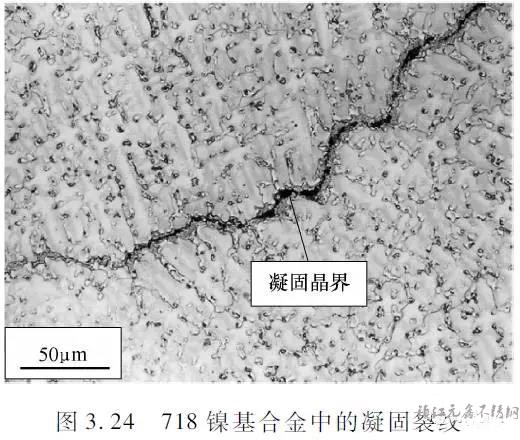 通常情況下,以奧氏體(面心立方)為初生相凝固的材料比以鐵素體(體心立方)為初生相凝固的材料對凝固裂紋更為敏感。屬于這種規律的材料中,包括大多數的奧氏體不銹鋼、部分結構鋼以及全部的鎳基合金。圖3.24所示的例子是一個718鎳基高溫合金,718合金(Ni-20Cr-15Fe-5Nb-3Mo)是通過添加Nb來實現析出強化。大多數鎳基合金中的Nb偏析會產生一個共晶反應,導致最終的凝固組織是由NbC、富Nb的Laves相或者是由這些相的混合物所組成的。Nb偏析產生的凈效應是擴大了凝固溫度范圍,并且提高了裂紋敏感性。沿著凝固晶界的連續液態薄膜的痕跡非常明顯,如圖3.24所示,其中含有NbC,并且有可能存在Laves相。