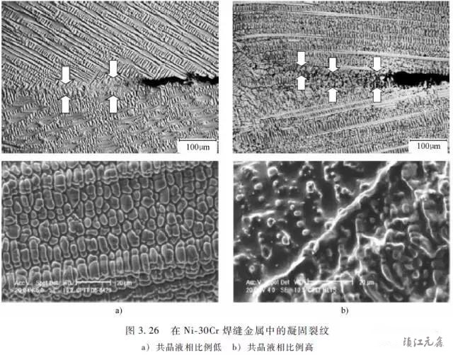 對于在凝固末期發生共晶反應的焊縫金屬來說,共晶反應將導致形成一定數量的共晶液相。根據母材和焊縫金屬的成分,建議針對在凝固末期形成共晶液相薄膜的體積分數和分布情況進行控制,盡管這樣做的方法不是最直接的。在共晶合金系統中,凝固裂紋抗力可以通過兩種措施來控制,一種是減少共晶液相薄膜的數量,另一種是通過增加共晶液相的數量直到達到可以實現裂紋回填的效果。通常情況下,減小凝固溫度范圍是降低焊縫凝固裂紋敏感性的最好方法,但這種方法不總是可以選擇的。