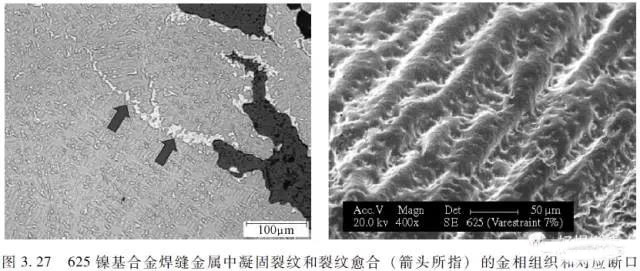 圖3.27所示為名義合金成分Ni-22Cr-9Mo-3.5Nb的625鎳基填充金屬的焊縫凝固裂紋的一組金相和斷口照片。如前所述,在鎳基合金凝固過程中,Nb會強烈地再分配,并在凝固末期促進γ/NbC共晶相和(或)Laves相形成,出現足夠多的共晶液相,會促進液相沿著凝固晶界回填,如圖3.27中的箭頭所指。斷口形貌反映出了表面上所出現的這些共晶液相,應當指出,樹枝晶特征并不十分明顯,這是因為原始的樹枝晶表面已經被覆蓋在其上的共晶液相所罩住。