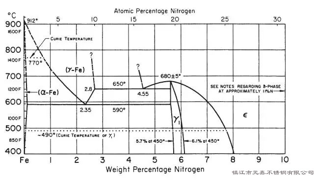 氮在鐵中的溶解度極限是具有溫度依賴性的,在450℃(840°F),鐵基合金將吸收高達5.7%至6.1%的N。除此之外,合金鋼表面相的形成主要傾向于是ε相。
