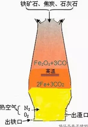 高爐生產時,從爐頂裝入鐵礦石、焦炭、造渣用熔劑(石灰石),從位于爐子下部沿爐周的風口吹入經預熱的空氣。在高溫下焦炭中的碳同鼓入空氣中的氧燃燒生成的一氧化碳和氫氣,在爐內上升過程中除去鐵礦石中的氧,從而還原得到鐵。煉出的鐵水從鐵口放出。