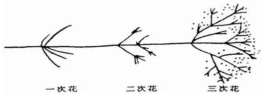 隨著碳含量的增加,在芒線上繼續爆裂產生二次花、三次花不等。在芒線附近所呈現的明亮的小點稱為花粉。