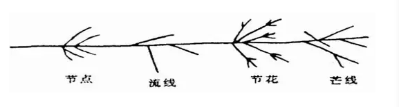 流線上明亮而又較粗的點稱為節點。火花在爆裂時,產生的若干短線條稱為芒線。芒線所組成的火花稱為節花。
