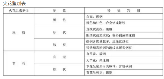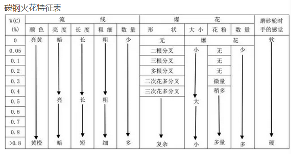鋼中的碳是形成火花的基本元素,當鋼中含有錳、硅、鎢、鉻、鉬等元素時,它們的氧化物將影響火花的線條、顏色和狀態。根據火花的特征,可大致判斷出鋼材的碳含量和其它元素的含量。