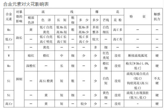 合金鋼的火花特征與其含有的合金元素有關。一般情況下,鎳、硅、鉬、鎢等元素抑制火花爆裂,而錳、釩鉻等元素卻可助長火花爆裂。所以對合金鋼的鑒別難掌握。