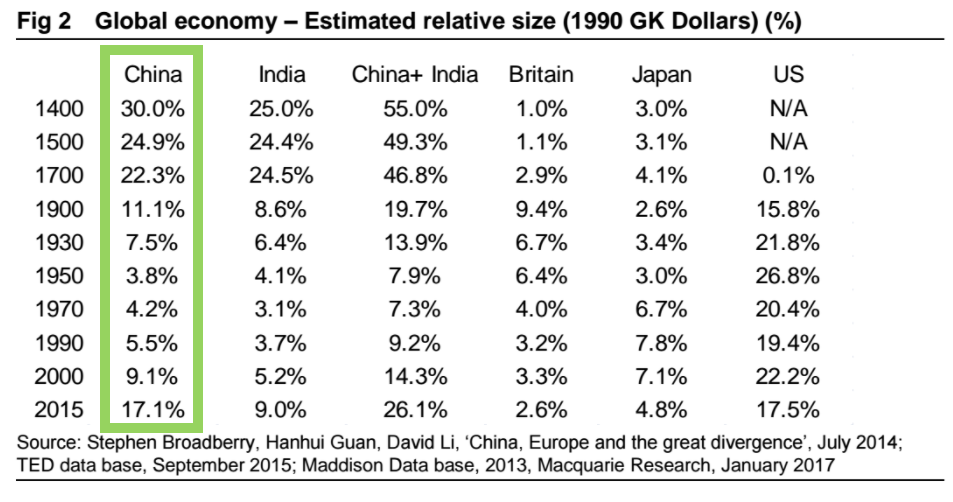 第一張圖顯示了,麥格理研究預測各國從1400年到2015年,中國、印度、日本等主要大國經濟占據全球經濟的百分比。