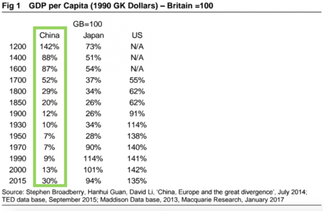 Viktor Shvets表示,13世紀到14世紀之間,除了意大利,中國是世界全富有的國家,甚至到了17世紀,中國的生活水平與英國大致相當。不過此后到20世紀70年代,中國人均GDP相對于英國一路下滑。1950-1970年,中國人均GDP僅相當于英國生活水平的7%左右。自1990年,中國生活水平開始回升,如今依然無法回到1200-1600年的輝煌時期。