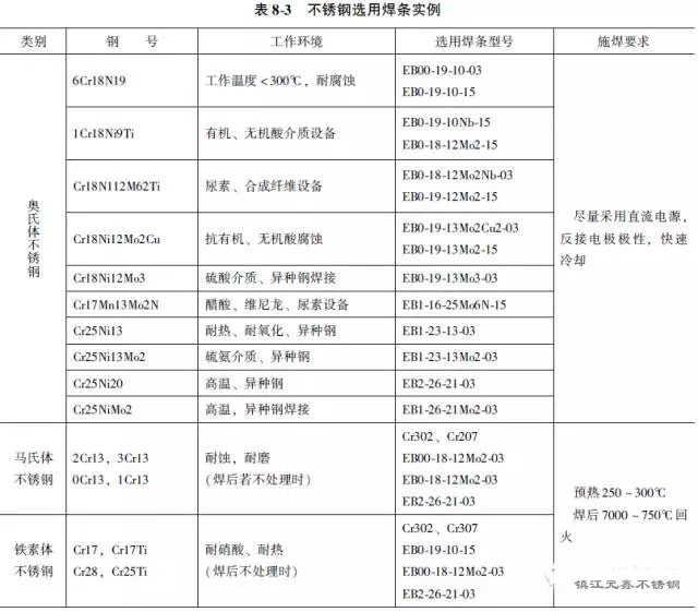 1) 必須根據母材的成分、產品使用要求正確地選擇焊條。表8-3列出了幾種國產焊條型號及其特點,以供參考。由于不銹鋼金屬系列很多,每一牌號焊條都有其最適用的工作條件,選擇時要適當。奧氏體鋼焊條,按藥皮類型來說,常用的有低氫鈉型和鈦鈣兩類。鈦鈣型焊條如EB0-19-10-03、EB0-18-120Mo2-03等,電弧穿透淺,適于薄板平焊位置焊接。若用直流焊接電源時,也可進行全位置和中板的焊接,但要求技術熟練。低氫鈉型焊條如EB0-19-10Nb-15、EB1-23-13-15等適于全位置和中厚板的焊接,不易產生夾渣、未焊透等缺陷。從抗裂角度考慮,傾向于采用低氫鈉型焊條,但焊縫成形不如鈦鈣型,因而對耐蝕性也有些不利。(http://www.gyyyzx.com.cn)