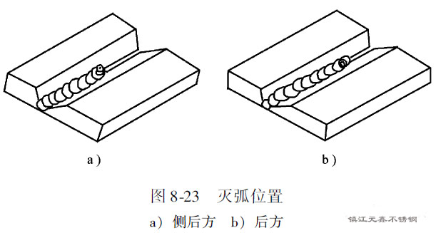 4)焊接電纜卡頭在工件上要卡緊,以免發生打弧現象,燒傷表面。引弧可以采用劃擦法,但最好采用碰擊法,并且都應在坡口內進行。嚴禁在鋼板上隨便引弧,以免電弧擦傷處腐蝕性能的降低。更換焊條或者焊接中斷后繼續焊接時,重新引弧的位置應在離末尾焊點10mm的焊道上,然后以普通焊速將電弧移到末尾焊點上,進行接頭的焊接。滅弧時,一般應把電弧移到熔池的后方或側后方,然后熄滅。這樣可以使收弧點逐漸縮小,并且落在焊道上,如圖8-23所示。其優點是收尾熔池飽滿,不易產生裂紋。