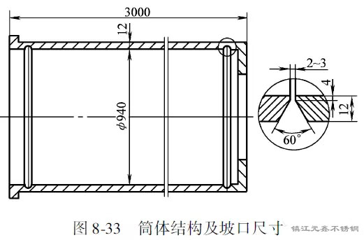筒體縱縫、環縫的坡口形式均為V形,如圖8-33所示。坡口用機械加工方法或用碳弧氣刨刨成,氣刨后的坡口表面要清除熔渣,并打磨光亮。筒體所有縱環焊縫的坡口開在筒內,鈍邊開在筒外。其優點是焊根在筒體外,便于碳弧氣刨進行清根操作,防止燒壞衣服和燙傷;另外,氣刨產生的熔渣不粘在筒體內壁上,保證筒內光潔,提高耐蝕性。