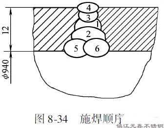 筒體成形后裝配定位焊,每隔200~250mm定位焊25mm,定位焊縫高度為4~5mm。施焊順序如圖8-34所示。先在筒內焊接第1~2道,這兩道焊縫的起焊和終止端應相反。然后在筒外清理焊根,再焊第3~4道。同樣注意各道之間的起焊與終止方向要相反。這樣焊波錯開以免產生夾渣。焊條不作橫向擺動,對準中心線焊接。清理焊根時在筒外用碳弧氣刨進行,碳棒直徑為8mm,電流為250~300A,碳棒與焊縫夾角45°,刨槽深4mm,將第一層焊道根部可能有缺陷的金屬全部刨除,刨后清除熔渣。當第三、四層焊道焊完之后,最后在筒內焊接與腐蝕介質相接觸的第五、六層焊道。