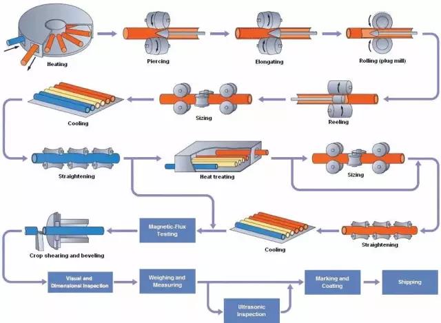 管坯準備及檢查→管坯加熱→穿孔→軋管→荒管再加熱→定(減)徑→熱處理→成品管矯直→精整→檢驗(無損、理化、臺檢) →入庫